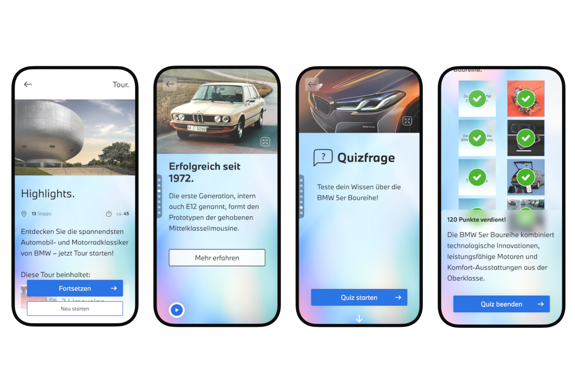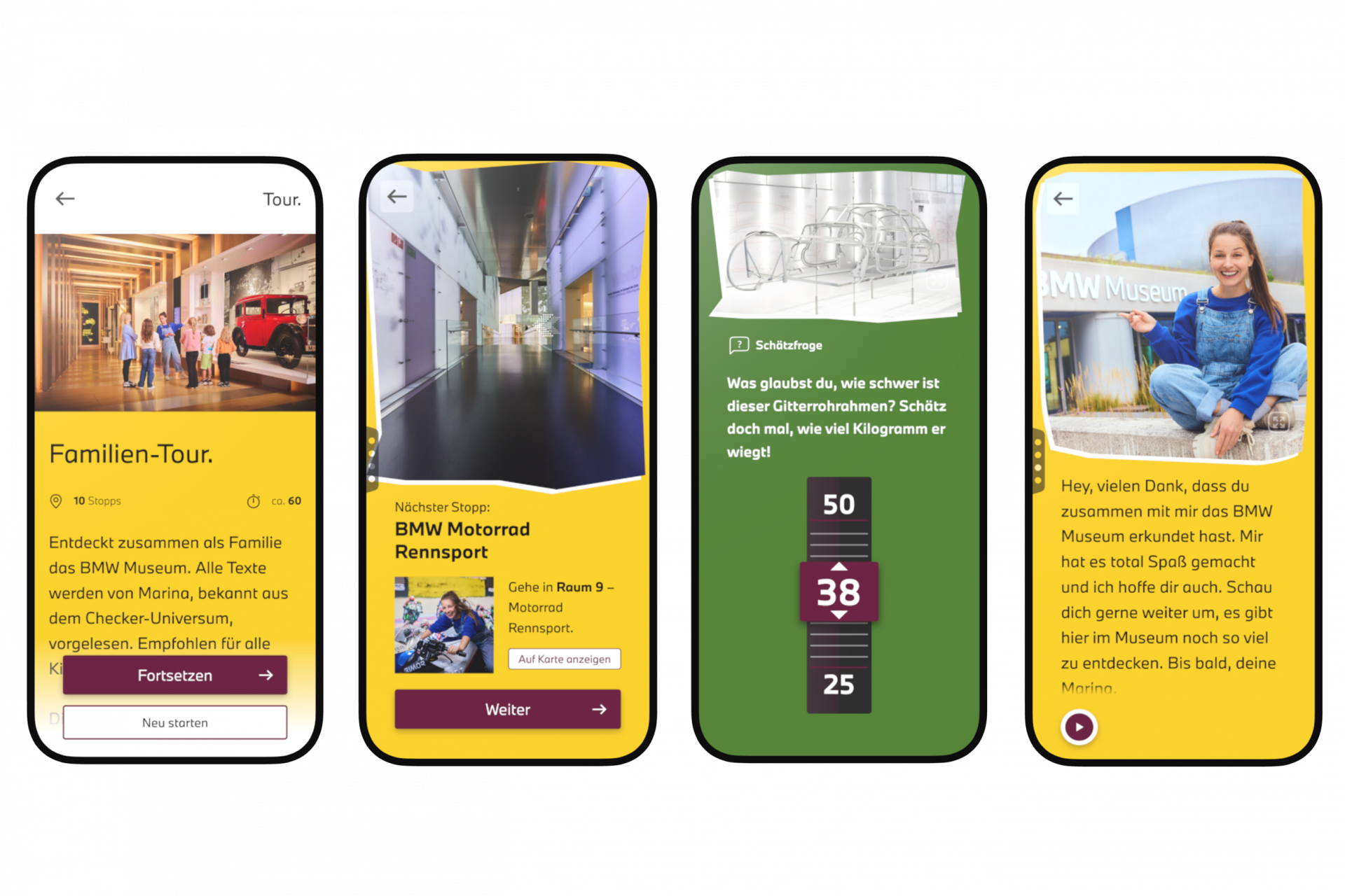 For the family tour, we have developed specific gamification elements to excite young car enthusiasts about the history of BMW. Children are guided playfully through various stations by quiz questions and mini-games. They are accompanied by Marina Blanke, also known as ‘Checkerin Marina’, whose recorded content is integrated directly into the app. This brings the museum’s themes to life, making the visit an entertaining and unforgettable experience for all.