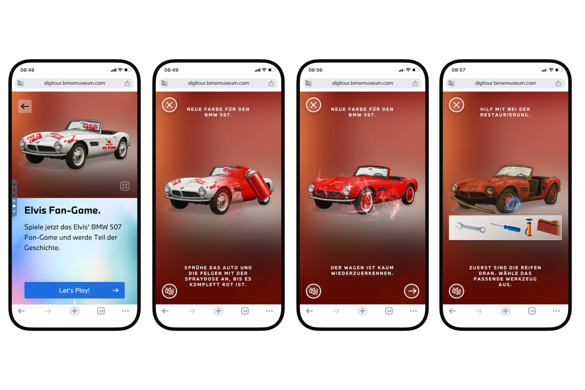 An interactive game was created for the famous BMW 507, once owned by Elvis Presley, bringing the vehicle’s history to life. Visitors take an active role by virtually restoring, painting, and repairing the car until it shines again in its brilliant white finish.